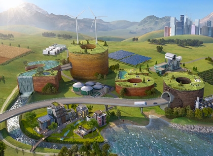 Une interface moderne et attractive réalisée en 3D s’appuyant sur un jeu visuel immersif et original entre les chiffres de 2050 et les ingrédients de ce que seront les nouvelles énergies renouvelables à cette échéance, dans un espace naturel et durable.