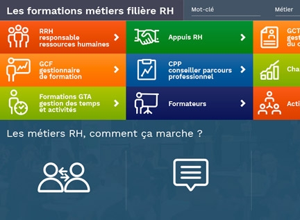 Une réalisation très ergonomique permettant l'accès à un catalogue de parcours et cursus de formations pour l'ensemble des métiers de la filière RH.