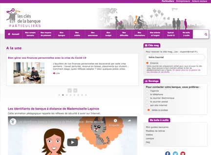 Pour le compte de la Fédération Bancaire Française, Conception, réalisation et développement HTML du site « Les clés de la banque » COM CI COM CA réalise le design complet pour les 3 sites destinés aux particuliers, entrepreneurs et acteurs sociaux. En créant une nouvelle ergonomie d'accès aux contenus, nous mettons en valeur la richesse encyclopédique du site. Nous réalisons également les animations en flash ainsi que l'intégration HTML dans le respect scrupuleux des normes d'accessibilité de Braille Net.