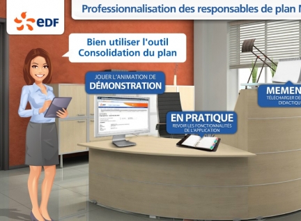 Pour le compte d'EDF, conception, réalisation et développement d'un module d'e-learning à destination des responsables de plan MOA (maîtrise d'ouvrage). Marie, un avatar humanisé, guide les utilisateurs pour leur expliquer pas à pas pas le fonctionnement d'un logiciel interne initialement trop complexe d'utilisation. Cet outil permet aux MOA d'appréhender chaque étape de l'utilisation du logiciel ou de se concentrer sur un thème qu'ils peuvent choisir en fonction de leurs besoins.